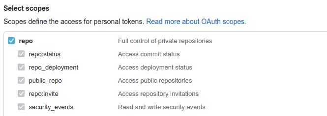 Klik bij Select scopes die onderdelen aan waar "repo" bij staat.